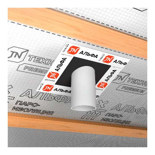 Применяется с уличной стороны с подкровельными ветро- влагозащитными мембранами или с внутренней стороны с пароизоляционными пленками. Разный размер отверстий манжеты позволяет их использовать с трубами разных диаметров, от 120 до 170 мм. Крепление манжеты к пленке осуществляется односторонней соединительной лентой ТЕХНОНИКОЛЬ АЛЬФАБЭНД 60 или односторонней соединительной лентой АЛЬФАБЭНД СТРОНГ 60.